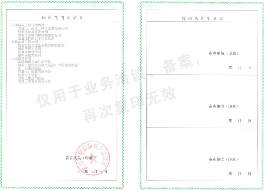 2021年10月公司獲批建設(shè)工程質(zhì)量檢測機(jī)構(gòu)資質(zhì)證書
